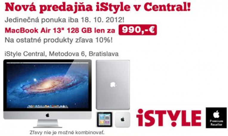 Na prvý deň si iStyle pripravil skutočne výnimočnú ponuku - MacBook Air 13" 128 GB SSD, 4GB RAM za neuveriteľných 990 EUR. Štandardná cena za tento model ultratenkého notebooku je 1259 EUR, zľava je teda celých 269 EUR, kvôli ktorej sa skutočne oplatí navštíviť predajňu iStyle v deň otvorenia. Okrem tejto ponuky získajú všetci nakupujúci zľavu 10% na ďalšie Apple produkty a príslušenstvo.